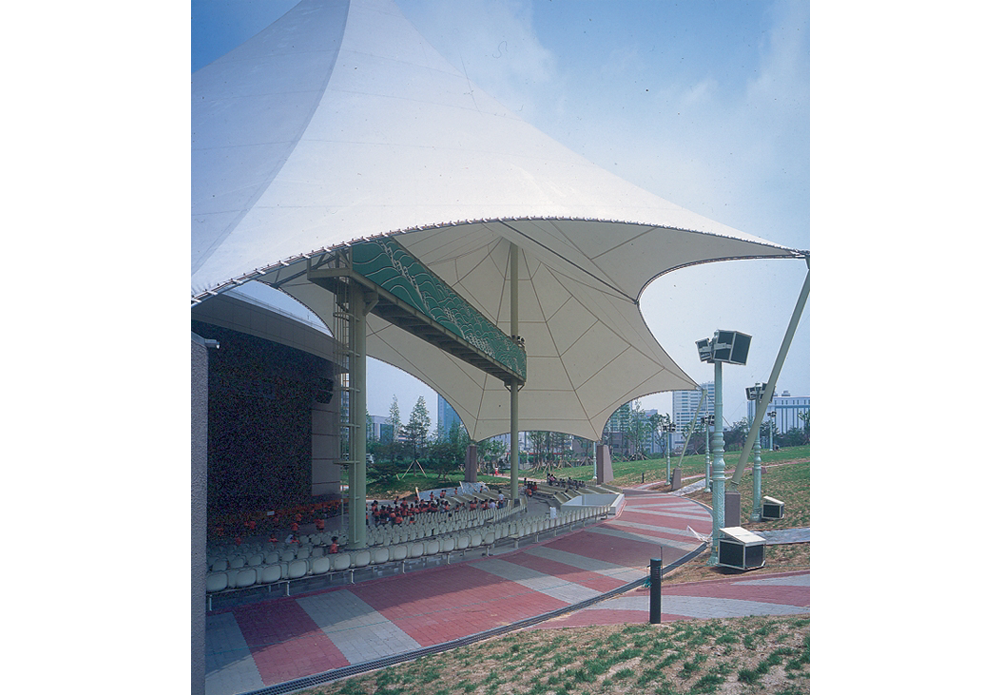 형태는 중압감을 해소하고 주변들과 조화를 이루고 있다. 막구조로 된 객석 상부 차양은 반투광성을 가지고 있어 자연광이